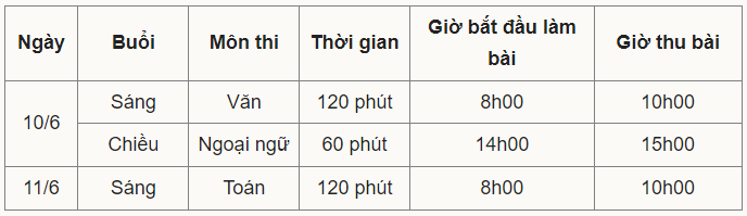 Theo kế hoạch ngày 13/3 của Sở Giáo dục và Đào tạo Hà Nội, sáng 10/6, thí sinh thi Ngữ văn, chiều cùng ngày thi Ngoại ngữ. Đến ngày 11/6, thí sinh thi Toán buổi sáng, nghỉ chiều. Lịch thi này không thay đổi so với thông tin dự kiến hồi tháng 2.